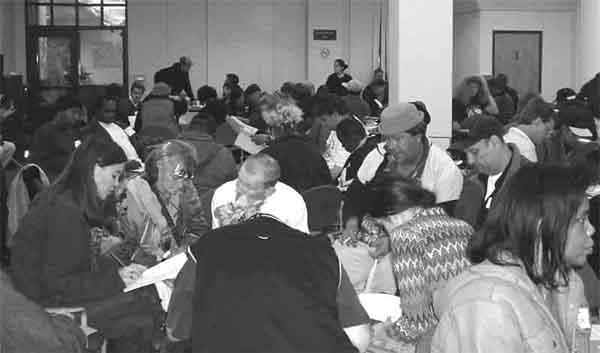 On October 23, 2002, we held our first ever Hotel Tenants Convention. Planned by tenants and for tenants, over 150 residents attended from over 50 hotels. On October 29, 2003, we held our second Hotel Tenants Convention. This time, over 300 tenants from 100 hotels attended. The conventions included workshops on tenants rights, the history of residential hotels in San Francisco, and neighborhood resources. Tenants also get a chance to work in small groups to discuss the most pressing problems facing hotel residents and brainstorm some solutions. Annual conventions will be held each year in the fall. |