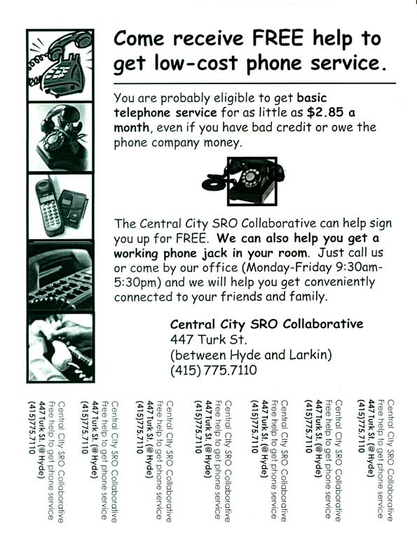 Universal Lifeline Telephone Service The Central City SRO Collaborative made improving access to low-cost telephone service a major part of its program in 2003 and 2004. The Collaborative got a grant and became a Community Based Organization (CBO) with the state's Universal Lifeline Telephone Service Program. As a CBO, the Collaborative got phones for more people who previously did not have them than any other CBO in the state. |